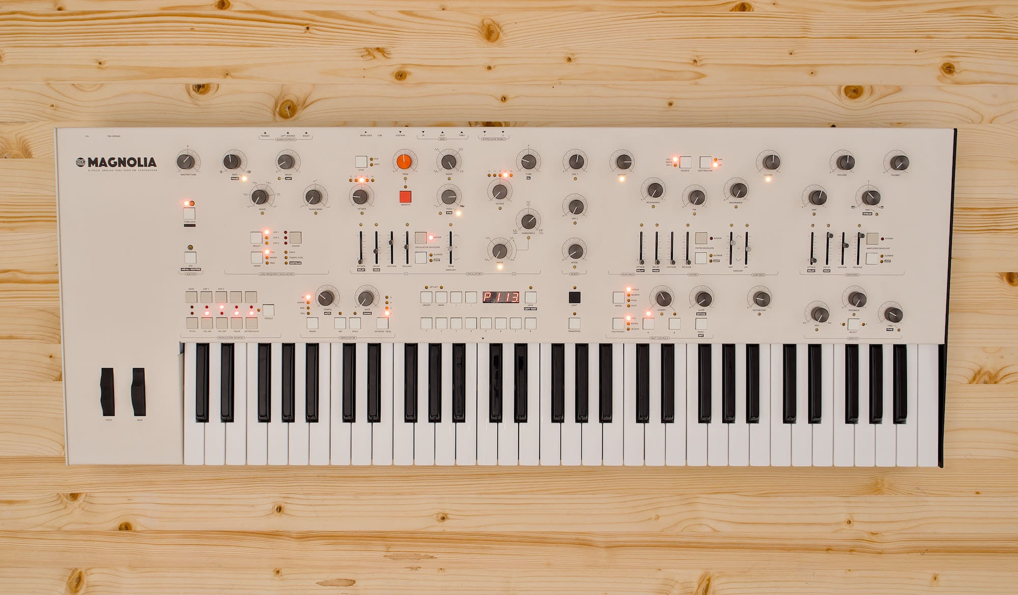 FM (Frequency Modulation) — to which the enthralling 8-VOICE ANALOG THRU-ZERO FM SYNTHESIZER wording tastefully incorporated into Magnolia’s fetching front panel (partly) owes its existence — is often regarded as carriers, operators, and formula weirdness. While this is arguably an accurate depiction of the most refined FM implementation — popularised by many Eighties era digital synthesizers, such as the Yamaha DX7, the Japanese giant behind that super-seller single-handedly successfully commercialising the FM synthesis algorithm developed by American composer, inventor, musician, and professor John Chowning at Stanford University, CA, USA back in 1967, it should not be forgotten that, at the end of the day, FM synthesis itself is simply an oscillator modulating another one at audio rate to create complex sounds. Though this is what is found on Magnolia — albeit its two oscillators per voice beautifully blend an ‘East Coast’ oscillator with PWM (Pulse Width Modulation) and a ‘West Coast’ oscillator with linear TZFM (Thru-Zero Frequency Modulation), wavefolder, and flip sync — alongside an orange TZFM knob to tweak things, it is a more raw and in-your-face way of doing FM without precise ratios and indices, and an approach that its creator guarantees is incredibly fun to play with!