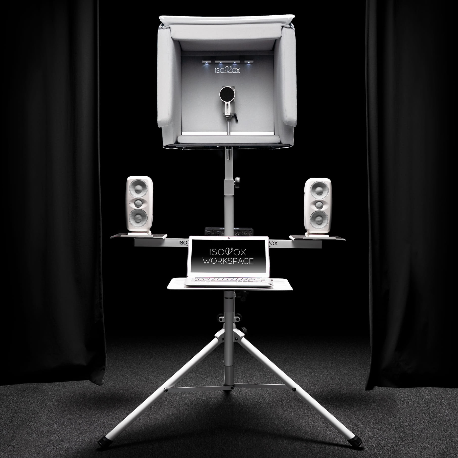 While WorkSpace fits many stands, ISOVOX® recommends TriPod (https://isovoxbooth.com/products/isovox-tripod-stand) — included (as a choice) when purchasing ISOVOX® 2 (https://isovoxbooth.com/pages/isovox-2-portable-vocal-booth), billed as being a revolutionary portable isolation booth by providing recording capabilities on a par with professional studios with no need to soundproof an entire room — for stability and seamless integration. It is even possible to rotate the portable vocal booth concerned through 180°, allowing a performer to face away from the mix station while someone else controls the session — a great setup for collaborative recording. Reality dictates, though, that WorkSpace also functions beautifully as a standalone workstation — no ISOVOX® 2 necessarily needed, in other words.